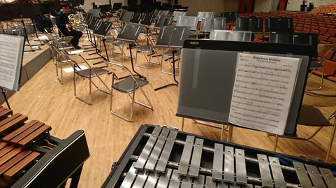 現役生達は、小雨降る午前中から会場に到着。すぐに楽器荷物の搬入や舞台のセッティングを始め、昼食を挟んで午後から2部→3部→1部の順にリハーサルを行い、18時の開演に備えていました。